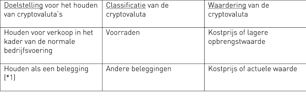 Tabel classificatie en waardering van cryptovaluta’s